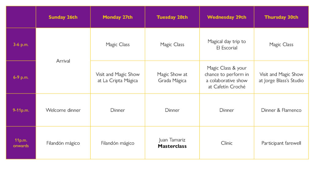 - 5 full days immersed in Spanish Magic and the philosophy of Juan Tamariz, right in the heart of Madrid